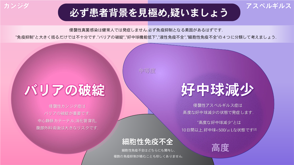 #7. カンジダ 必ず患者背景を見極め,疑いましょう アスペルギルス 侵襲性真菌感染は健常人では発症しません.必ず免疫抑制となる素因があるはずです. “免疫抑制”と大きく括るだけでは不十分です.“バリアの破綻”,“好中球機能低下”,“液性免疫不全”,“細胞性免疫不全”の4つに分類して考えましょう. 中等度 好中球減少 バリアの破綻 侵襲性カンジダ症は 侵襲性アスペルギルス症は バリアの破綻が重要です. 高度な好中球減少の状態で発症します. 中心静脈カテーテル,消化管穿孔, “高度な好中球減少”とは 腹部外科術後は大きなリスクです. 10日間以上,好中球<500/μLな状態です[2] 細胞性免疫不全 細胞性免疫不全はどちらにも関与し, 複数の免疫抑制が絡むことも珍しくありません. 高度