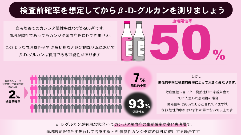 #9. 検査前確率を想定してからβ-D-グルカンを測りましょう 血培陽性率 血液培養でのカンジダ陽性率はわずか50%[5]です. 血培が陰性であってもカンジダ菌血症を除外できません. このような血培陰性例や,治療初期など限定的な状況において % β-D-グルカンは有用である可能性があります. 敗血性ショック 発熱性好中球減少症 ICU入室 2 7% 陽性的中率 しかし, 陽性的中率は検査前確率によって大きく異なります. 敗血症性ショック・発熱性好中球減少症で % 検査前確率 93% 偽陽性率 ICUに入室した患者群の場合, 偽陽性率は93%であるとされています[6]. なお,陰性的中率はいずれの群でも97%以上です. β-D-グルカンが有用な状況とは,カンジダ菌血症の事前確率が高い患者層で, 血培結果を待たず先行して治療するとき,侵襲性カンジダ症の除外に使用する場合です.