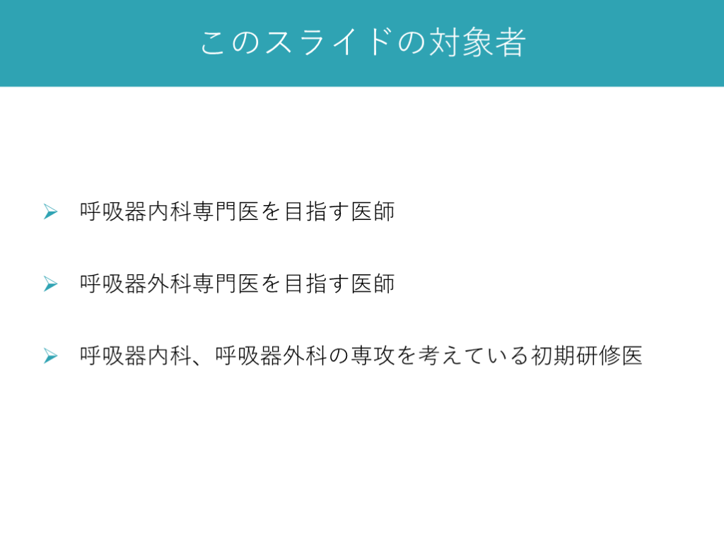 #2. このスライドの対象者 呼吸器内科専門医を目指す医師 呼吸器外科専門医を目指す医師 呼吸器内科、呼吸器外科の専攻を考えている初期研修医