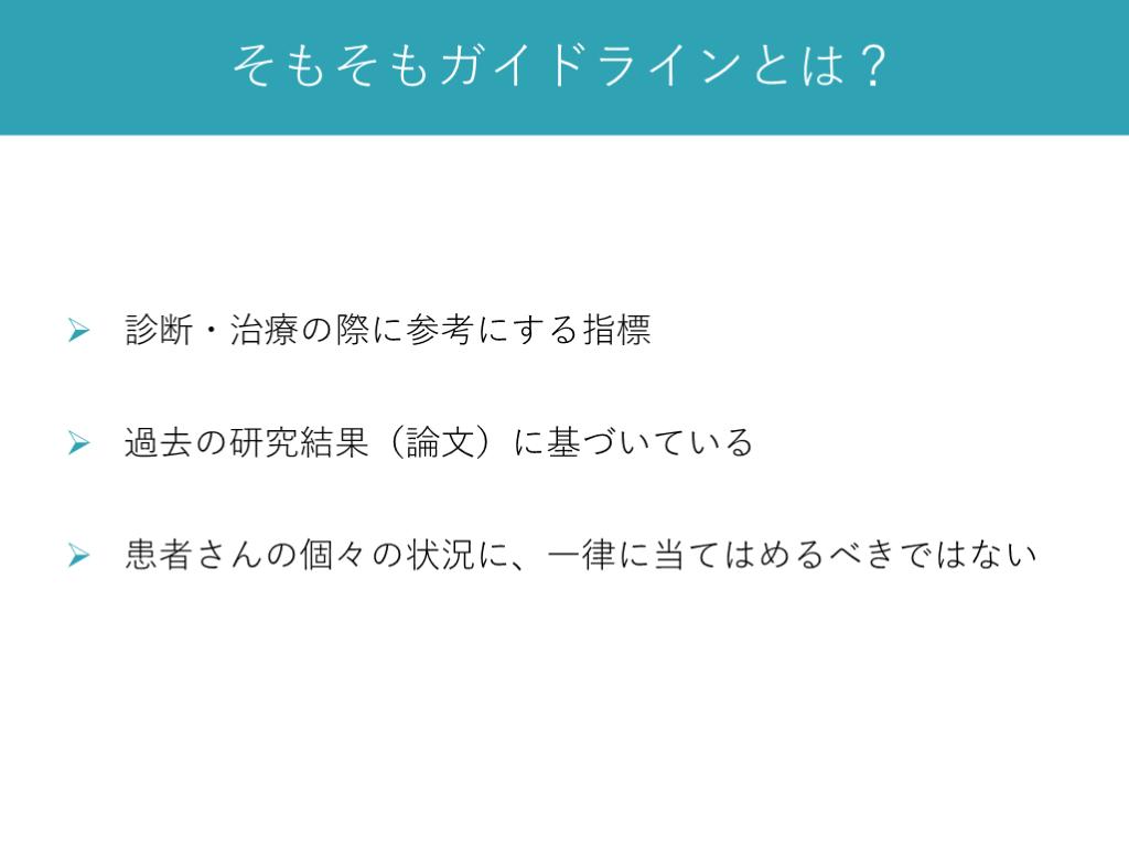 #4. そもそもガイドラインとは? 診断・治療の際に参考にする指標 過去の研究結果(論文)に基づいている 患者さんの個々の状況に、一律に当てはめるべきではない