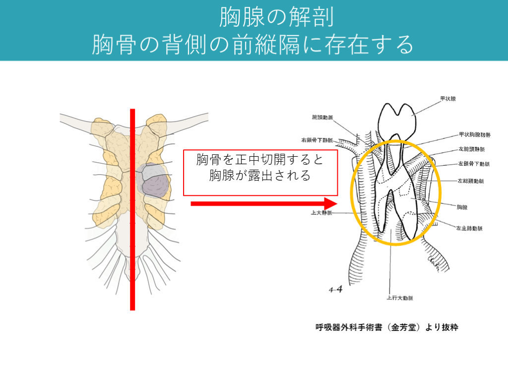 胸骨の背側の前縦隔に存在する 呼吸器外科手術書(金芳堂)より抜粋 胸骨を正中切開すると