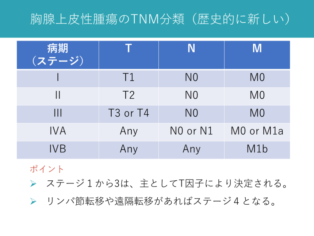 #11. 胸腺上皮性腫瘍分類 胸腺上皮性腫瘍のTNM分類(歴史的に新しい) ステージ1から3は、主としてT因子により決定される。