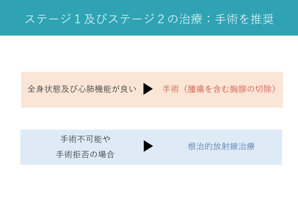 手術(腫瘍を含む胸腺の切除) 全身状態及び心肺機能が良い 根治的放射線治療 手術不可能や