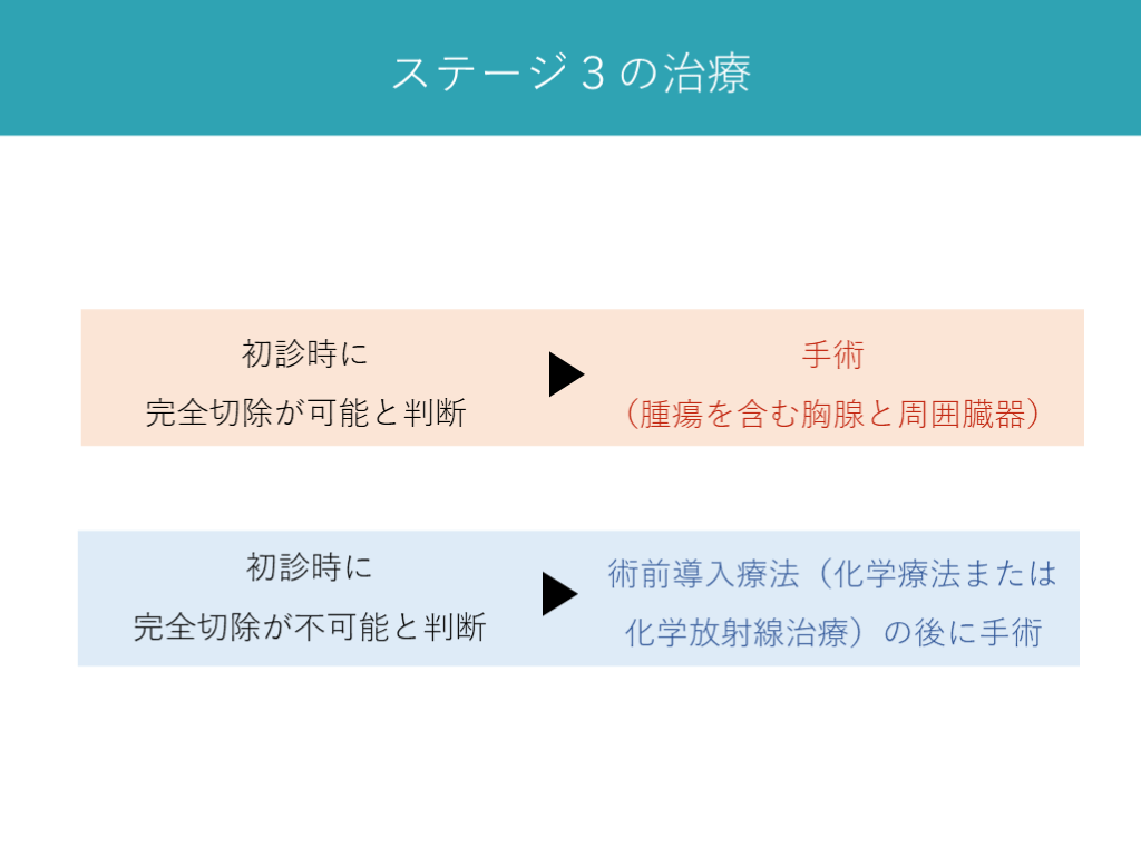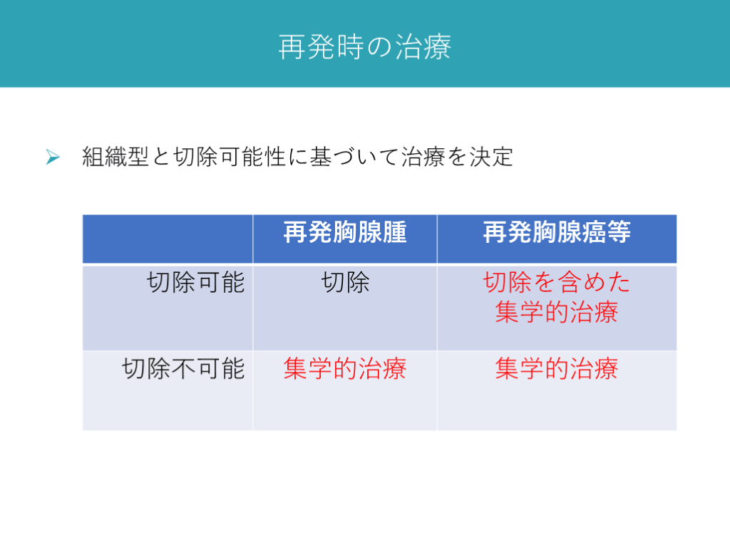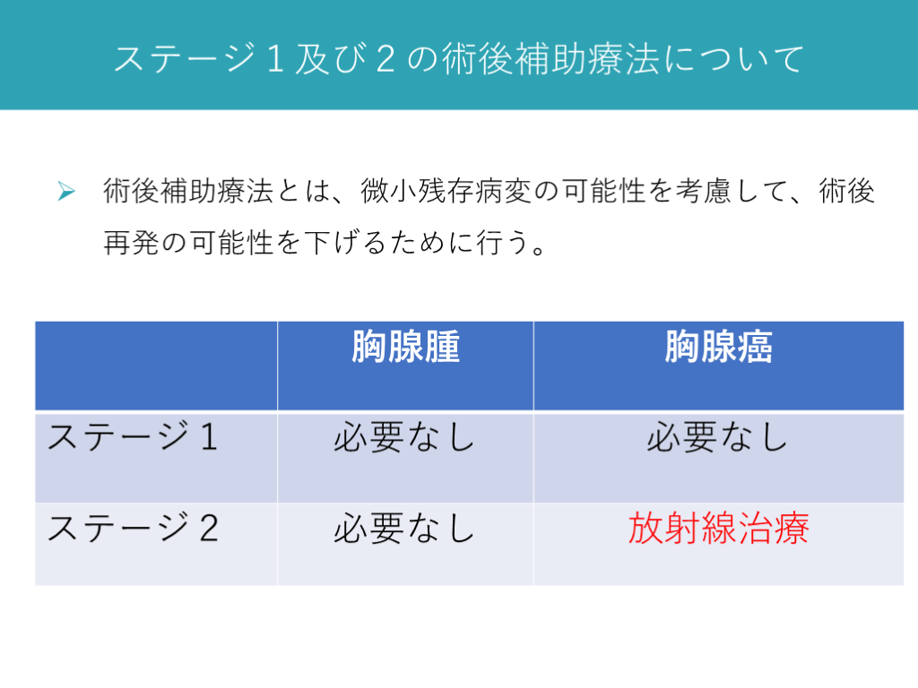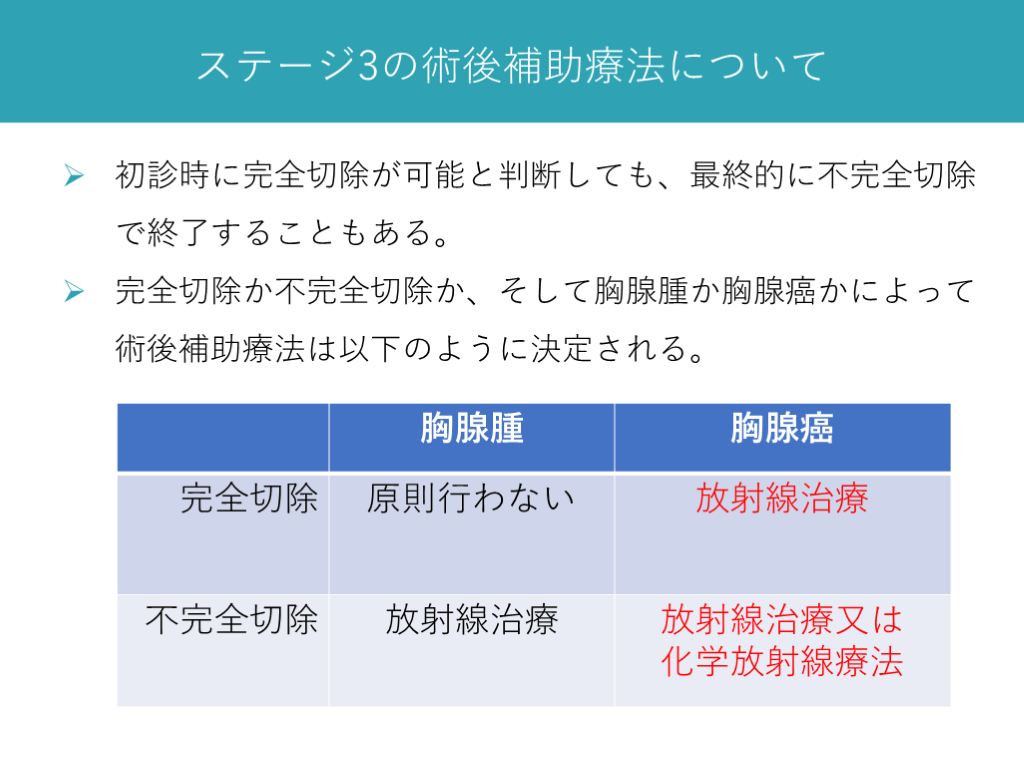 完全切除か不完全切除か、そして胸腺腫か胸腺癌かによって術後補助療法は以下のように決定される。