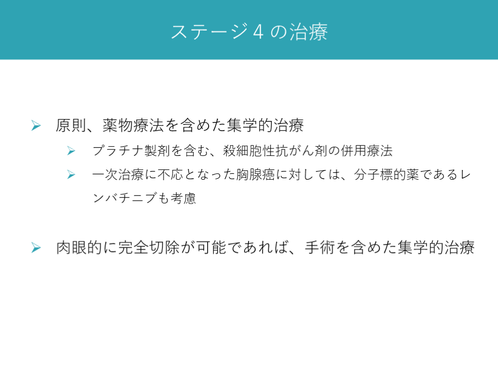一次治療に不応となった胸腺癌に対しては、分子標的薬であるレンバチニブも考慮