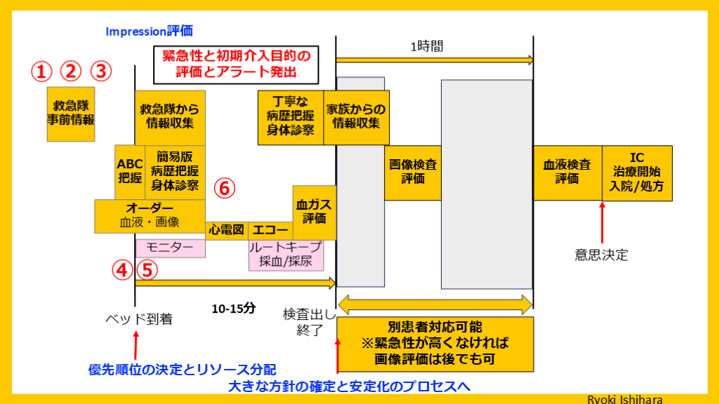 本スライドは、救急外来における患者対応の迅速化と効率化をテーマにしています。医師は、救急医療システムの理解や専門診療科との連携を深めながら、トリアージスキルや適切な初期介入が求められます。また、コメディカルとの連携や情報の迅速な伝達が生死を分ける重要な要素となります。特に、初期評価においては、患者のプロファイル把握や危険シグナルの把握が不可欠です。具体的な手法としては、MIST+VやSBARなどのフレームワークを用いて、迅速かつ正確な情報共有を実現します。このような基本的な対応が救急外来での診療スピード向上に貢献します。