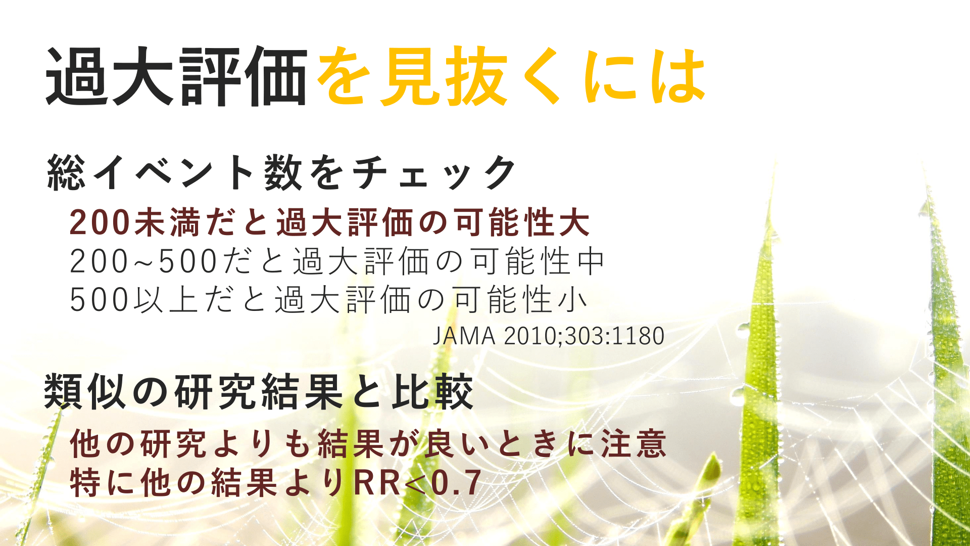 #11. 過大評価を見抜くには 総イベント数をチェック 200未満だと過大評価の可能性大 200~500だと過大評価の可能性中 500以上だと過大評価の可能性小 JAMA 2010;303:1180 類似の研究結果と比較 他の研究よりも結果が良いときに注意 特に他の結果よりRR<0.7