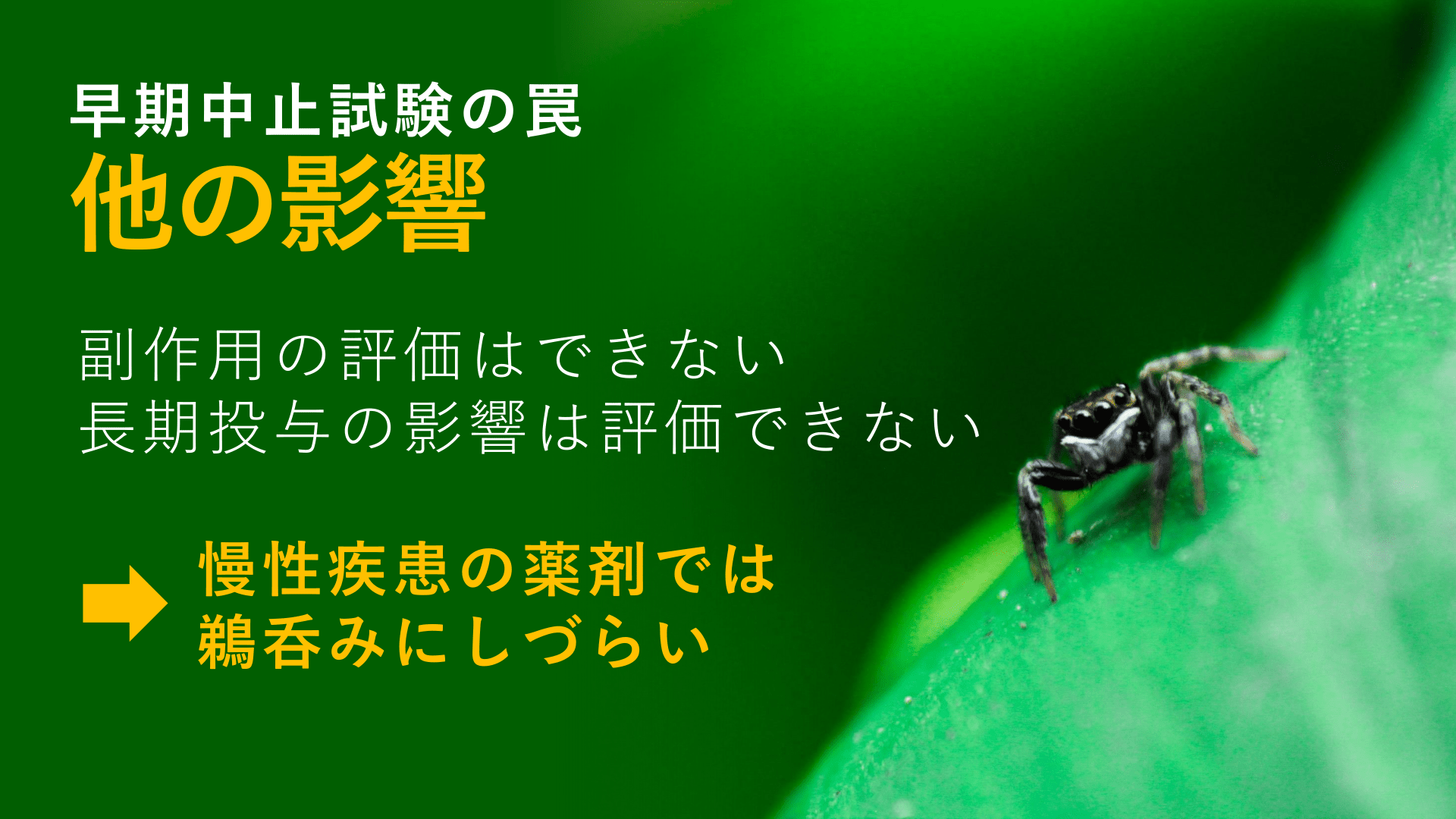 #12. 早期中止試験の罠 他の影響 副作用の評価はできない 長期投与の影響は評価できない 慢性疾患の薬剤では 鵜呑みにしづらい