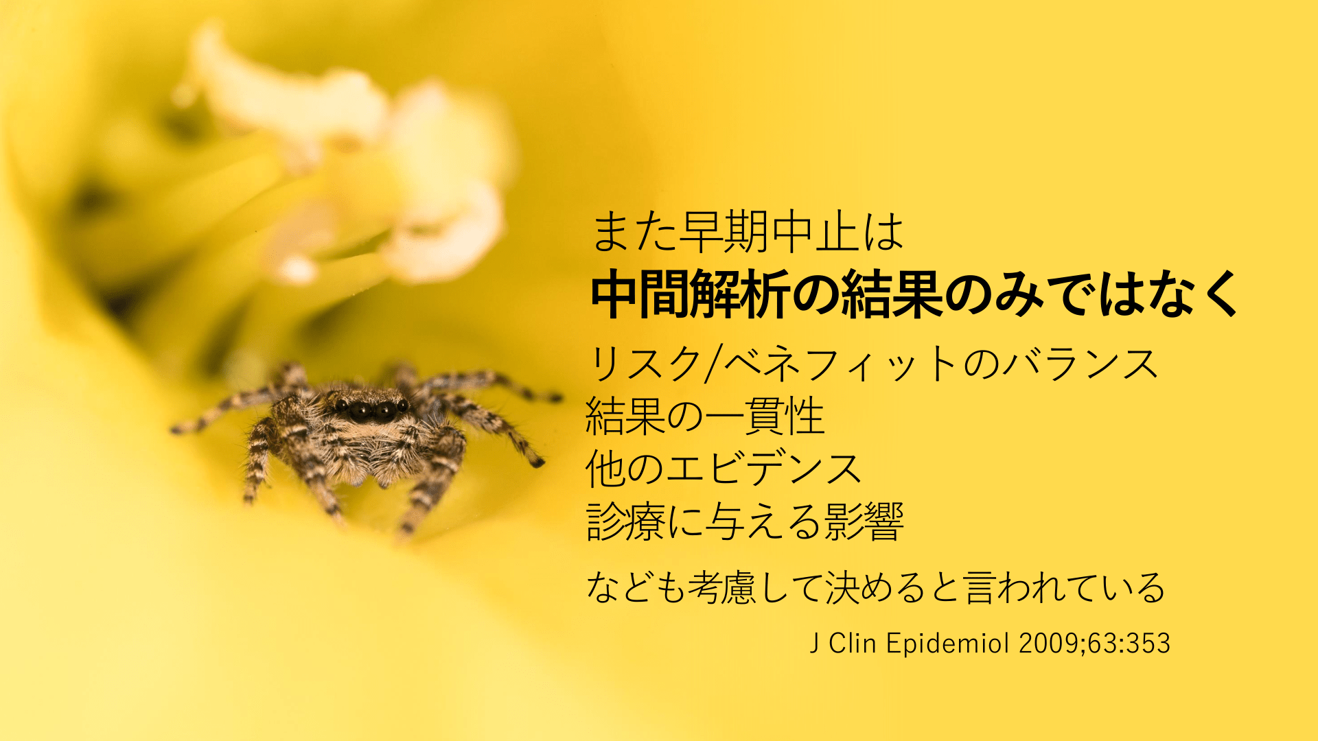 #6. また早期中止は 中間解析の結果のみではなく リスク/ベネフィットのバランス 結果の一貫性 他のエビデンス 診療に与える影響 なども考慮して決めると言われている J Clin Epidemiol 2009;63:353