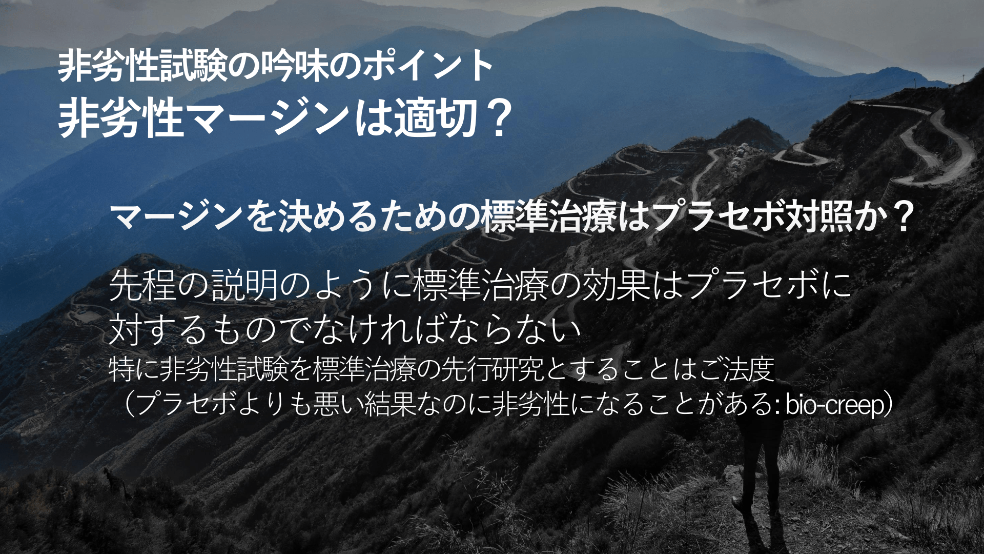 #15. 非劣性試験の吟味のポイント 非劣性マージンは適切? マージンを決めるための標準治療はプラセボ対照か? マージンは臨床的には「大目に見てやれるか」?