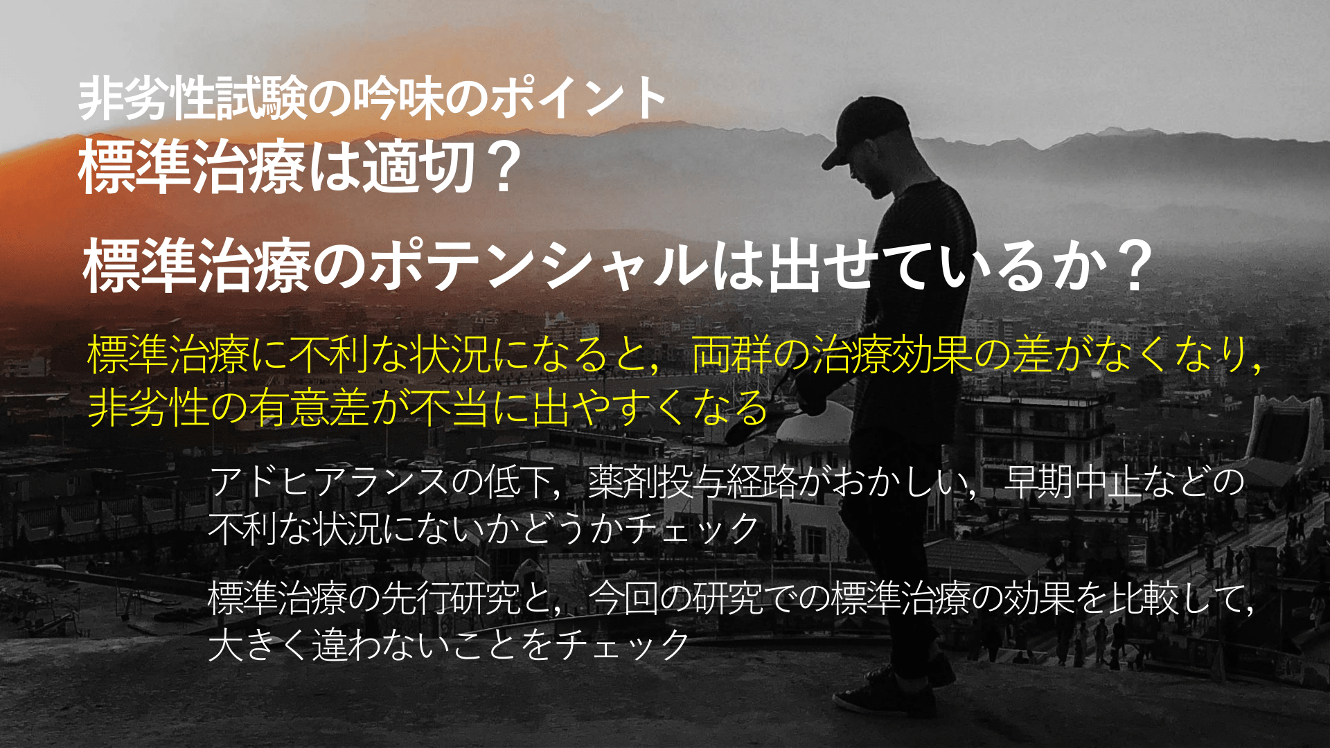 #18. 非劣性試験の吟味のポイント 標準治療は適切? 標準治療は確立したものか? 標準治療のポテンシャルは出せているか?