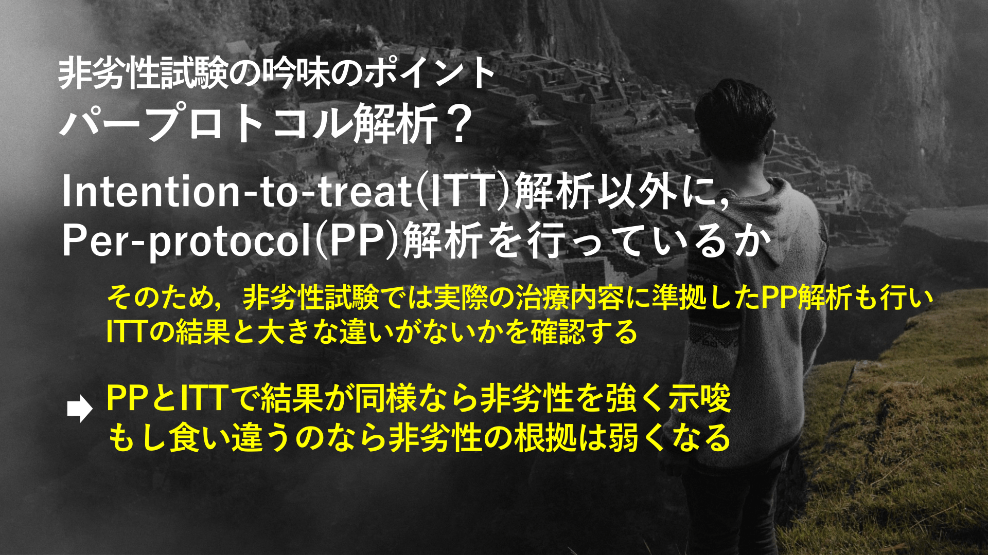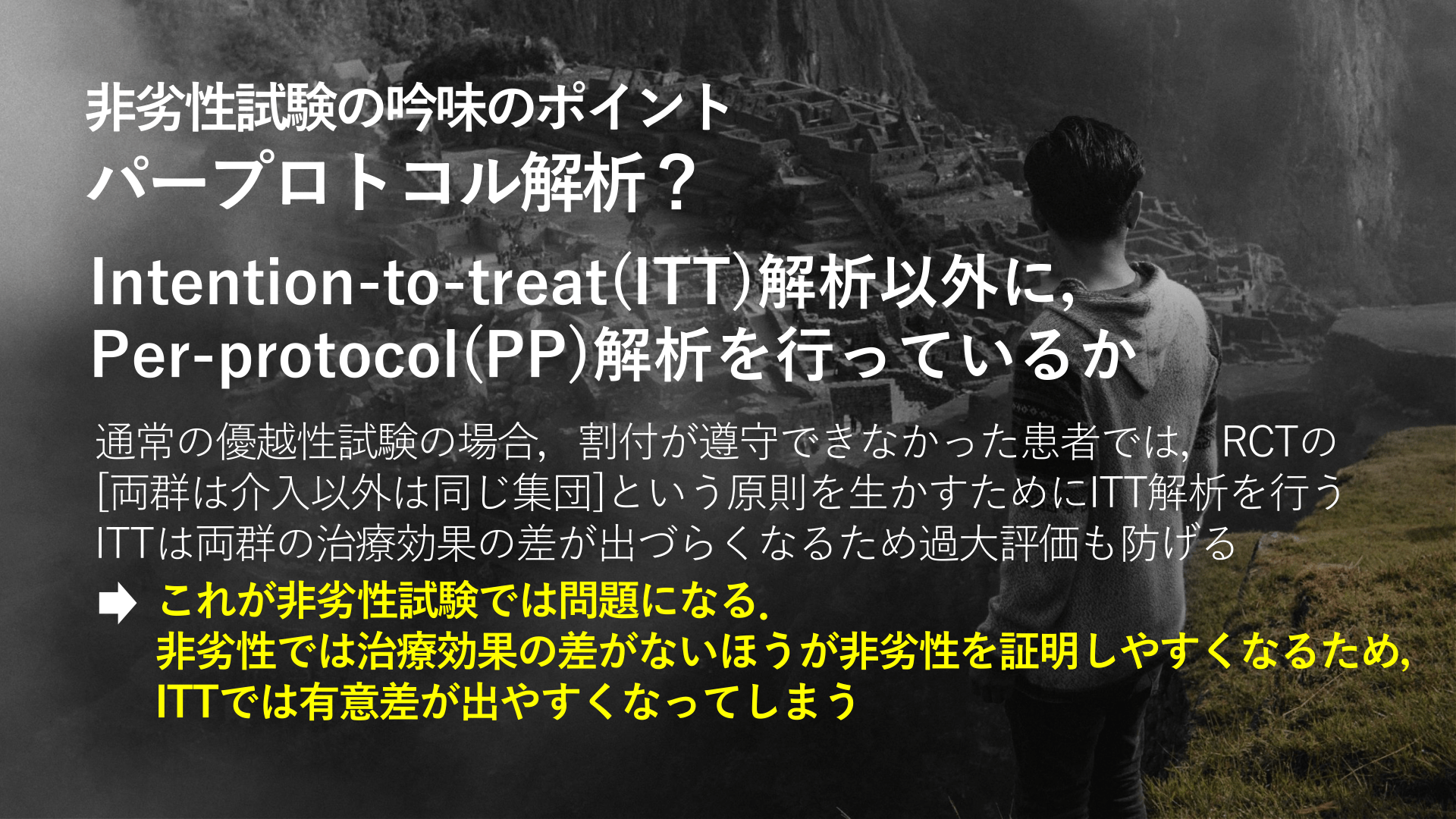 #22. 非劣性試験の吟味のポイント パープロトコル解析? Intention-to-treat(ITT)解析以外に, Per-protocol(PP)解析を行っているか 通常の優越性試験の場合,割付が遵守できなかった患者では,RCTの [両群は介入以外は同じ集団]という原則を生かすためにITT解析を行う ITTは両群の治療効果の差が出づらくなるため過大評価も防げる これが非劣性試験では問題になる. 非劣性では治療効果の差がないほうが非劣性を証明しやすくなるため, ITTでは有意差が出やすくなってしまう