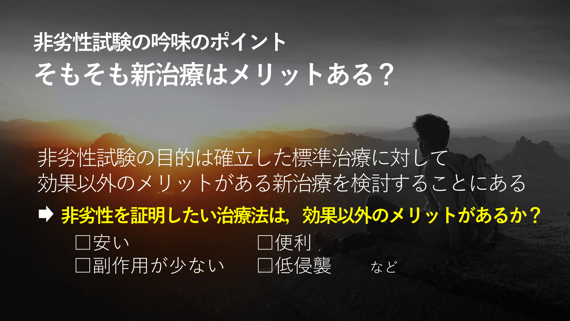 #24. 非劣性試験の吟味のポイント そもそも新治療はメリットある? 非劣性試験の目的は確立した標準治療に対して 効果以外のメリットがある新治療を検討することにある 非劣性を証明したい治療法は,効果以外のメリットがあるか? □安い □便利 □副作用が少ない □低侵襲 など