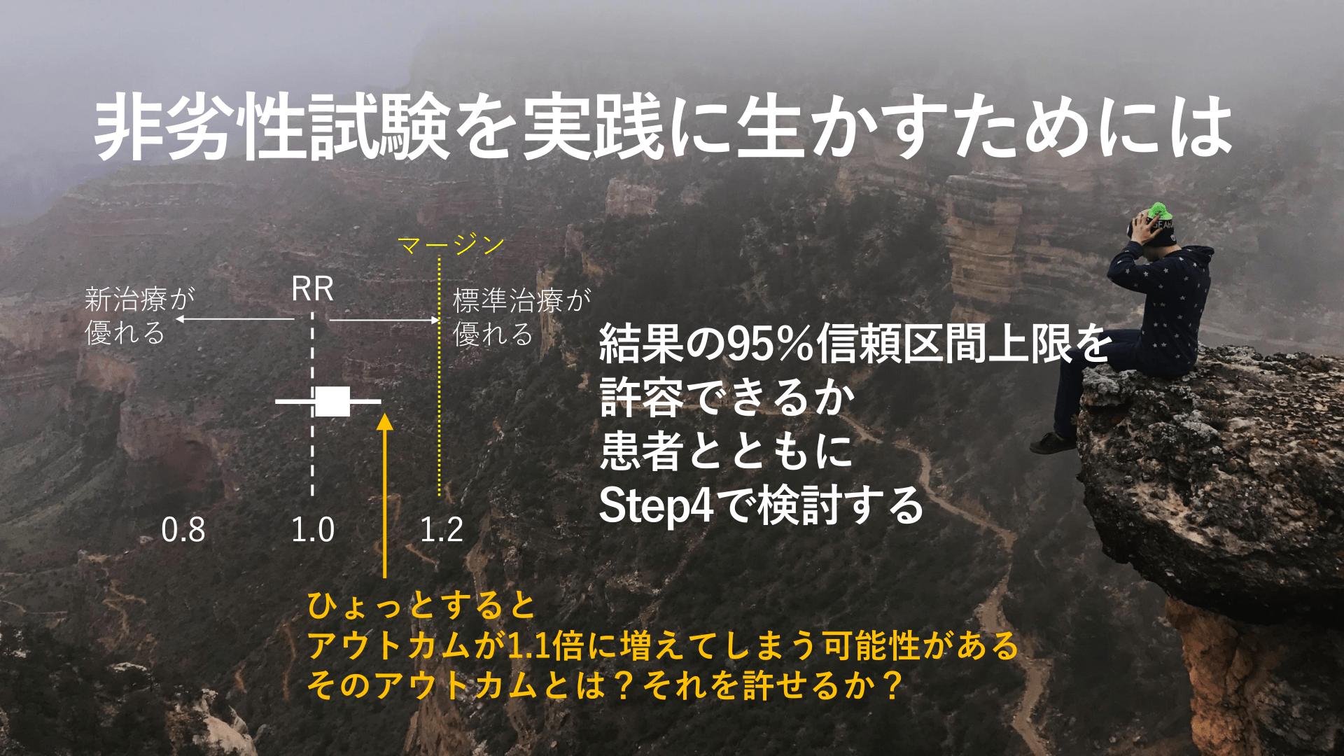 #25. 非劣性試験を実践に生かすためには マージン 新治療が 優れる 0.8 RR 1.0 標準治療が 優れる 1.2 結果の95%信頼区間上限を 許容できるか 患者とともに Step4で検討する ひょっとすると アウトカムが1.1倍に増えてしまう可能性がある そのアウトカムとは?それを許せるか?