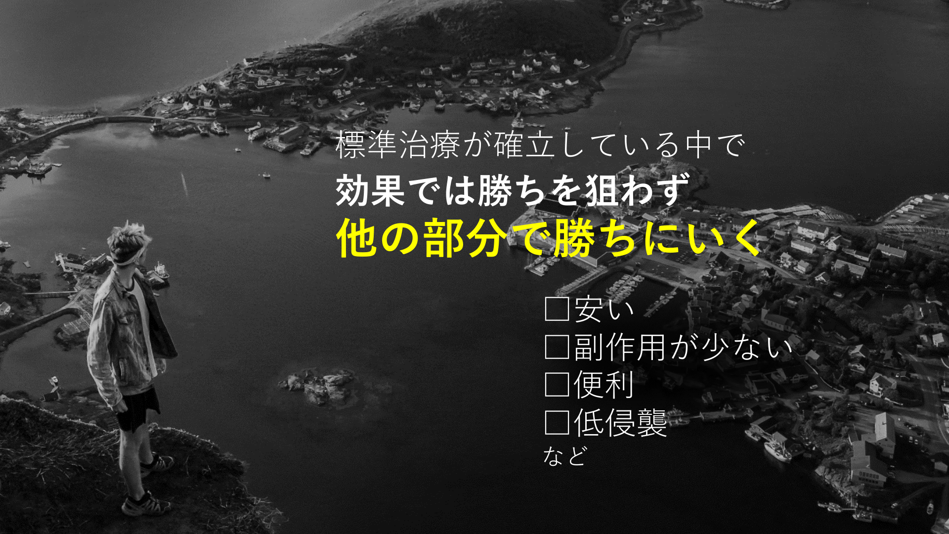 #3. 標準治療が確立している中で 効果では勝ちを狙わず 他の部分で勝ちにいく □安い □副作用が少ない □便利 □低侵襲 など