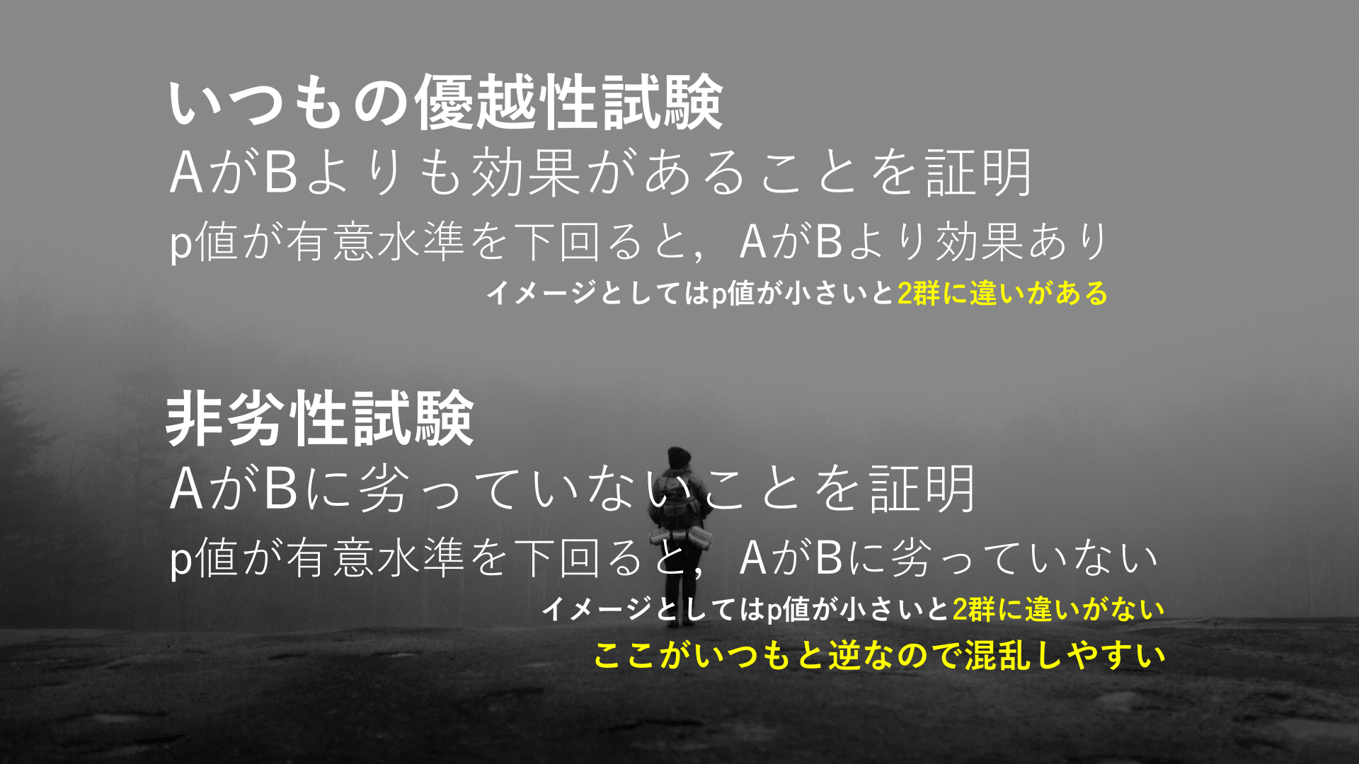 #5. いつもの優越性試験 AがBよりも効果があることを証明 p値が有意水準を下回ると,AがBより効果あり イメージとしてはp値が小さいと2群に違いがある 非劣性試験 AがBに劣っていないことを証明 p値が有意水準を下回ると,AがBに劣っていない イメージとしてはp値が小さいと2群に違いがない ここがいつもと逆なので混乱しやすい
