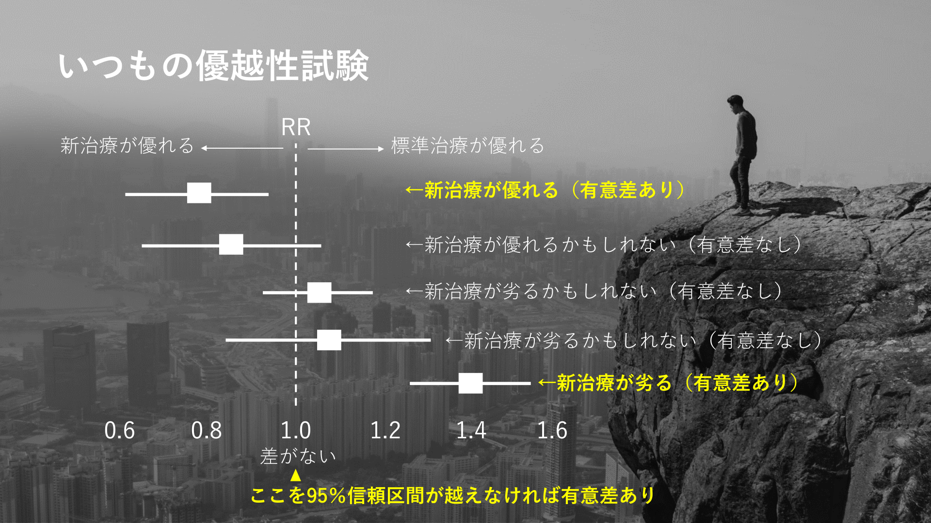 #7. いつもの優越性試験 新治療が優れる RR 標準治療が優れる ←新治療が優れる(有意差あり) ←新治療が優れるかもしれない(有意差なし) ←新治療が劣るかもしれない(有意差なし) ←新治療が劣るかもしれない(有意差なし) ←新治療が劣る(有意差あり) 0.6 0.8 1.0 1.2 1.4 1.6 差がない ここを95%信頼区間が越えなければ有意差あり