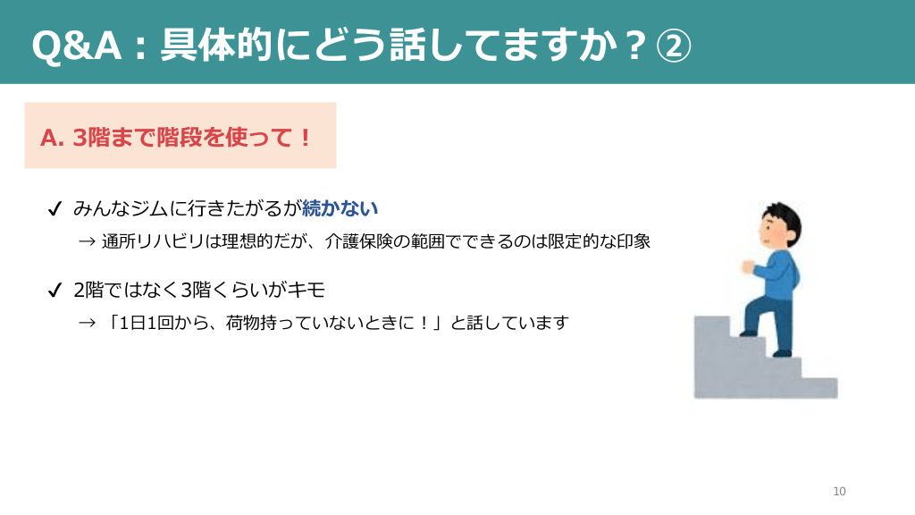 #10. Q&A:具体的にどう話してますか?② A. 3階まで階段を使って! ✔ みんなジムに行きたがるが続かない → 通所リハビリは理想的だが、介護保険の範囲でできるのは限定的な印象 ✔ 2階ではなく3階くらいがキモ → 「1日1回から、荷物持っていないときに!」と話しています 10