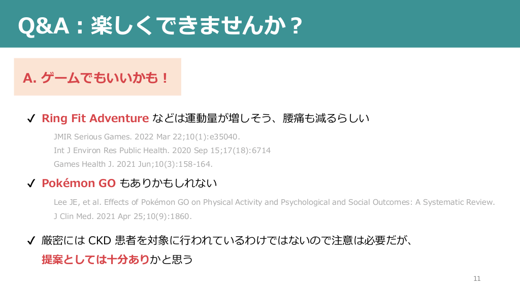 #11. Q&A:楽しくできませんか? A. ゲームでもいいかも! ✔ Ring Fit Adventure などは運動量が増しそう、腰痛も減るらしい JMIR Serious Games. 2022 Mar 22;10(1):e35040. Int J Environ Res Public Health. 2020 Sep 15;17(18):6714 Games Health J. 2021 Jun;10(3):158-164. ✔ Pokémon GO もありかもしれない Lee JE, et al. Effects of Pokémon GO on Physical Activity and Psychological and Social Outcomes: A Systematic Review. J Clin Med. 2021 Apr 25;10(9):1860. ✔ 厳密には CKD 患者を対象に行われているわけではないので注意は必要だが、 提案としては十分ありかと思う 11