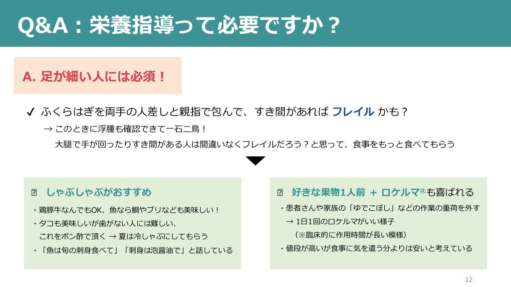 #12. Q&A:栄養指導って必要ですか? A. 足が細い人には必須! ✔ ふくらはぎを両手の人差しと親指で包んで、すき間があれば フレイル かも? → このときに浮腫も確認できて一石二鳥! 大腿で手が回ったりすき間がある人は間違いなくフレイルだろう?と思って、食事をもっと食べてもらう 🞐 しゃぶしゃぶがおすすめ 🞐 好きな果物1人前 + ロケルマⓇも喜ばれる ・鶏豚牛なんでもOK、魚なら鯛やブリなども美味しい! ・患者さんや家族の「ゆでこぼし」などの作業の重荷を外す ・タコも美味しいが歯がない人には難しい、 これをポン酢で頂く → 夏は冷しゃぶにしてもらう ・「魚は旬の刺身食べて」「刺身は泡醤油で」と話している → 1日1回のロケルマがいい様子 (※臨床的に作用時間が長い模様) ・値段が高いが食事に気を遣う分よりは安いと考えている 12