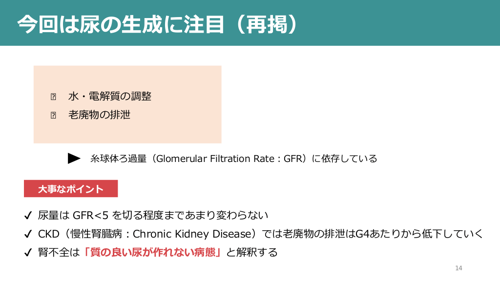 #14. 今回は尿の生成に注目(再掲) 🞐 水・電解質の調整 🞐 老廃物の排泄 糸球体ろ過量(Glomerular Filtration Rate:GFR)に依存している 大事なポイント ✔ 尿量は GFR<5 を切る程度まであまり変わらない ✔ CKD(慢性腎臓病:Chronic Kidney Disease)では老廃物の排泄はG4あたりから低下していく ✔ 腎不全は「質の良い尿が作れない病態」と解釈する 14