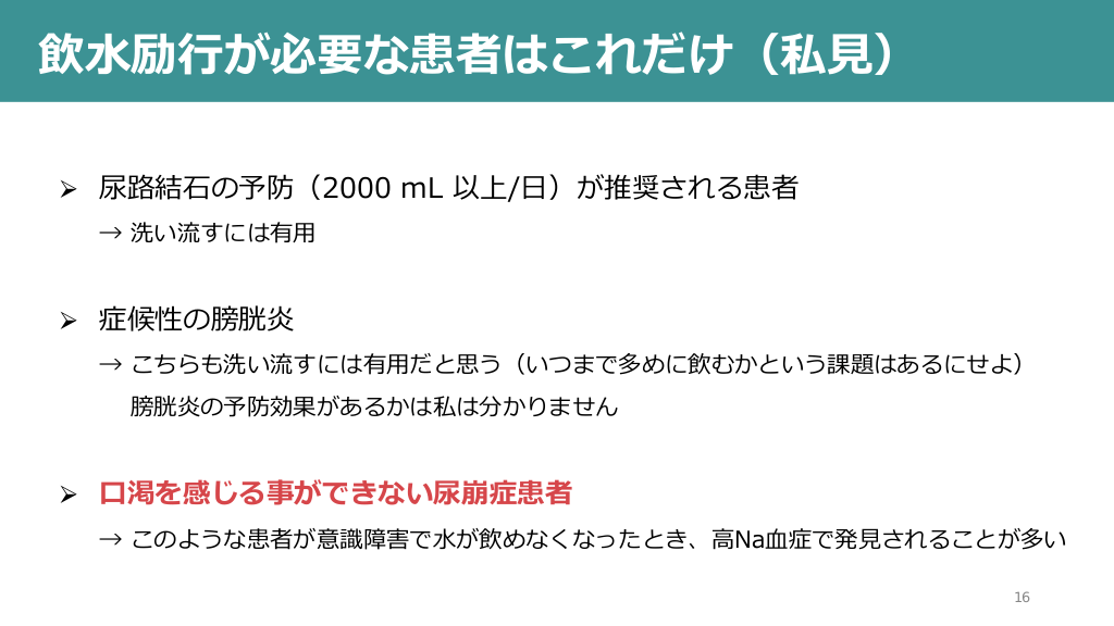 #16. 飲水励行が必要な患者はこれだけ(私見) ⮚ 尿路結石の予防(2000 mL 以上/日)が推奨される患者 → 洗い流すには有用 ⮚ 症候性の膀胱炎 → こちらも洗い流すには有用だと思う(いつまで多めに飲むかという課題はあるにせよ) 膀胱炎の予防効果があるかは私は分かりません ⮚ 口渇を感じる事ができない尿崩症患者 → このような患者が意識障害で水が飲めなくなったとき、高Na血症で発見されることが多い 16