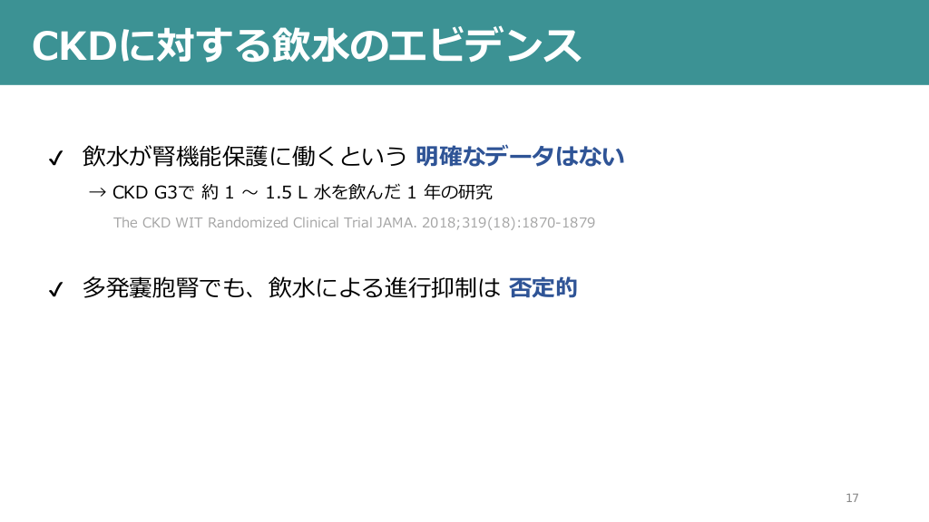 #17. CKDに対する飲水のエビデンス ✔ 飲水が腎機能保護に働くという 明確なデータはない → CKD G3で 約 1 〜 1.5 L 水を飲んだ 1 年の研究 The CKD WIT Randomized Clinical Trial JAMA. 2018;319(18):1870-1879 ✔ 多発嚢胞腎でも、飲水による進行抑制は 否定的 17