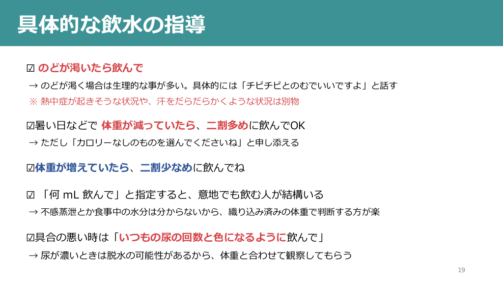#19. 具体的な飲水の指導 ☑ のどが渇いたら飲んで → のどが渇く場合は生理的な事が多い。具体的には「チビチビとのむでいいですよ」と話す ※ 熱中症が起きそうな状況や、汗をだらだらかくような状況は別物 ☑暑い日などで 体重が減っていたら、二割多めに飲んでOK → ただし「カロリーなしのものを選んでくださいね」と申し添える ☑体重が増えていたら、二割少なめに飲んでね ☑ 「何 mL 飲んで」と指定すると、意地でも飲む人が結構いる → 不感蒸泄とか食事中の水分は分からないから、織り込み済みの体重で判断する方が楽 ☑具合の悪い時は「いつもの尿の回数と色になるように飲んで」 → 尿が濃いときは脱水の可能性があるから、体重と合わせて観察してもらう 19