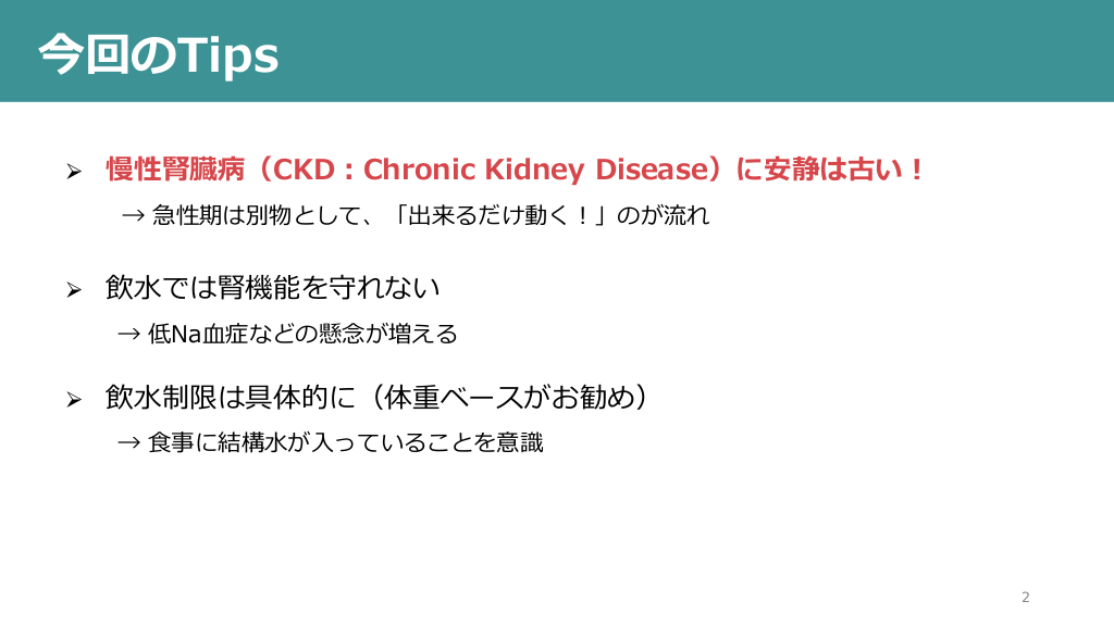 #2. 今回のTips ⮚ 慢性腎臓病(CKD:Chronic Kidney Disease)に安静は古い! → 急性期は別物として、「出来るだけ動く!」のが流れ ⮚ 飲水では腎機能を守れない → 低Na血症などの懸念が増える ⮚ 飲水制限は具体的に(体重ベースがお勧め) → 食事に結構水が入っていることを意識 2