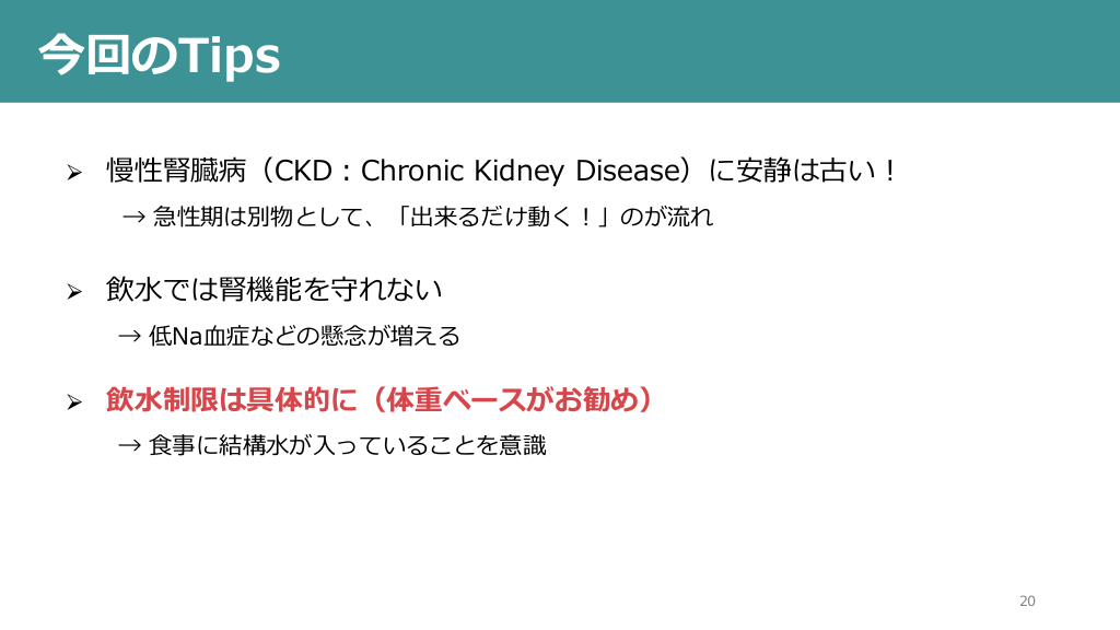 #20. 今回のTips ⮚ 慢性腎臓病(CKD:Chronic Kidney Disease)に安静は古い! → 急性期は別物として、「出来るだけ動く!」のが流れ ⮚ 飲水では腎機能を守れない → 低Na血症などの懸念が増える ⮚ 飲水制限は具体的に(体重ベースがお勧め) → 食事に結構水が入っていることを意識 20