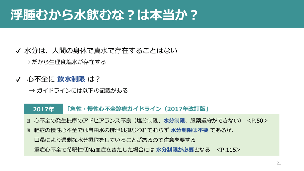 #21. 浮腫むから水飲むな?は本当か? ✔ 水分は、人間の身体で真水で存在することはない → だから生理食塩水が存在する ✔ 心不全に 飲水制限 は? → ガイドラインには以下の記載がある 2017年 「急性・慢性心不全診療ガイドライン(2017年改訂版」 🞐 心不全の発生機序のアドヒアランス不良(塩分制限、水分制限、服薬遵守ができない) <P.50> 🞐 軽症の慢性心不全では自由水の排泄は損なわれておらず 水分制限は不要 であるが、 口渇により過剰な水分摂取をしていることがあるので注意を要する 重症心不全で希釈性低Na血症をきたした場合には 水分制限が必要となる <P.115> 21
