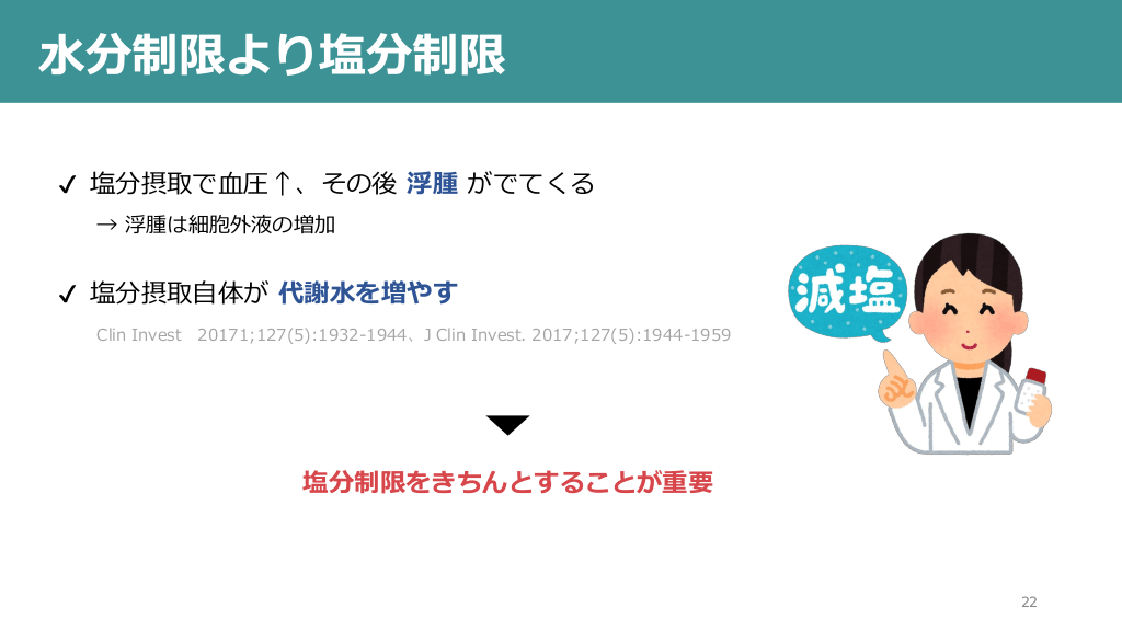 #22. 水分制限より塩分制限 ✔ 塩分摂取で血圧↑、その後 浮腫 がでてくる → 浮腫は細胞外液の増加 ✔ 塩分摂取自体が 代謝水を増やす Clin Invest 20171;127(5):1932-1944、J Clin Invest. 2017;127(5):1944-1959 塩分制限をきちんとすることが重要 22