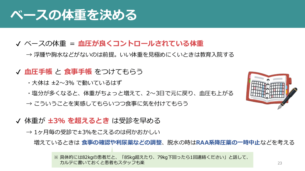 #23. ベースの体重を決める ✔ ベースの体重 = 血圧が良くコントロールされている体重 → 浮腫や胸水などがないのは前提。いい体重を見極めにくいときは教育入院する ✔ 血圧手帳 と 食事手帳 をつけてもらう ・大体は ±2〜3% で動いているはず ・塩分が多くなると、体重がちょっと増えて、2〜3日で元に戻り、血圧も上がる → こういうことを実感してもらいつつ食事に気を付けてもらう ✔ 体重が ±3% を超えるとき は受診を早める → 1ヶ月毎の受診で±3%をこえるのは何かおかしい 増えているときは 食事の確認や利尿薬などの調整、脱水の時はRAA系降圧薬の一時中止などを考える ※ 具体的には82kgの患者だと、「85kg超えたり、79kg下回ったら1回連絡ください」と話して、 カルテに書いておくと患者もスタッフも楽 23