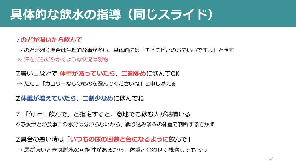 #24. 具体的な飲水の指導(同じスライド) ☑のどが渇いたら飲んで → のどが渇く場合は生理的な事が多い。具体的には「チビチビとのむでいいですよ」と話す ※ 汗をだらだらかくような状況は別物 ☑暑い日などで 体重が減っていたら、二割多めに飲んでOK → ただし「カロリーなしのものを選んでくださいね」と申し添える ☑体重が増えていたら、二割少なめに飲んでね ☑ 「何 mL 飲んで」と指定すると、意地でも飲む人が結構いる 不感蒸泄とか食事中の水分は分からないから、織り込み済みの体重で判断する方が楽 ☑具合の悪い時は「いつもの尿の回数と色になるように飲んで」 → 尿が濃いときは脱水の可能性があるから、体重と合わせて観察してもらう 24