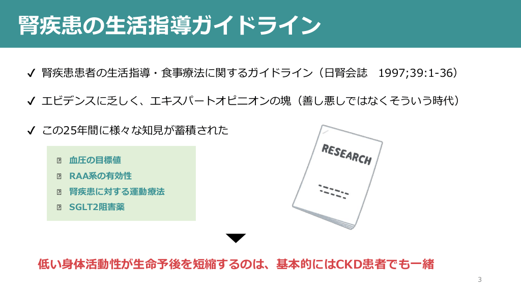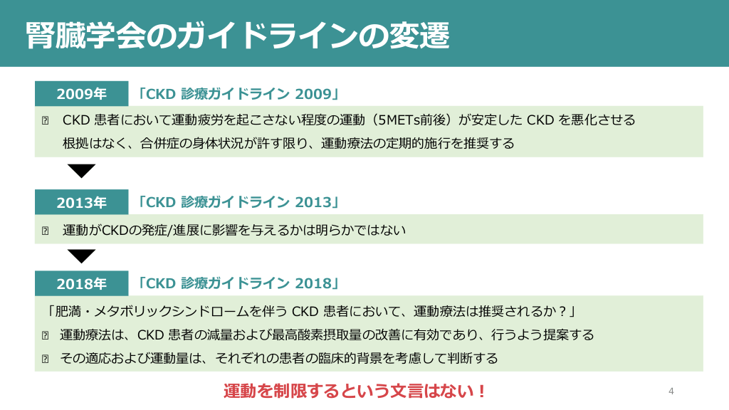 #3. 腎疾患の生活指導ガイドライン ✔ 腎疾患患者の生活指導・食事療法に関するガイドライン(日腎会誌 1997;39:1-36) ✔ エビデンスに乏しく、エキスパートオピニオンの塊(善し悪しではなくそういう時代) ✔ この25年間に様々な知見が蓄積された 🞐 血圧の目標値 🞐 RAA系の有効性 🞐 腎疾患に対する運動療法 🞐 SGLT2阻害薬 低い身体活動性が生命予後を短縮するのは、基本的にはCKD患者でも一緒 3