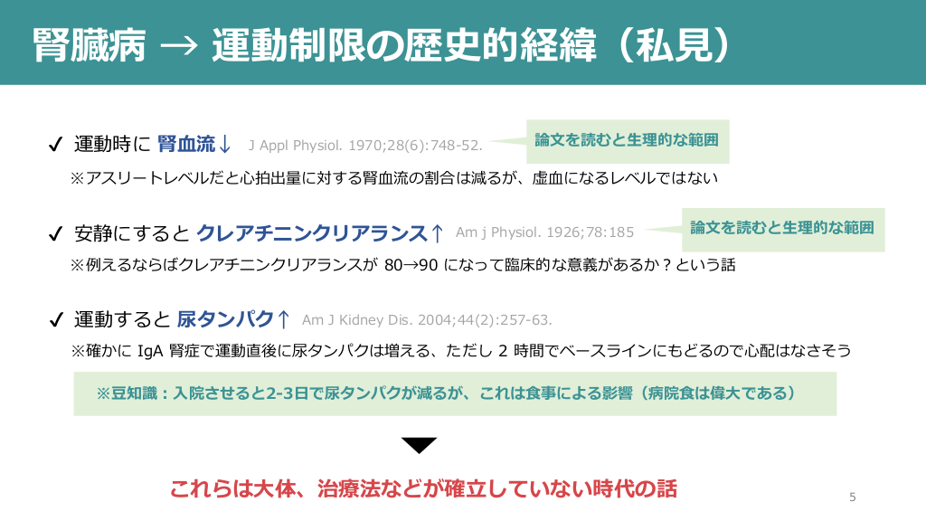 #5. 腎臓病 → 運動制限の歴史的経緯(私見) ✔ 運動時に 腎血流↓ J Appl Physiol. 1970;28(6):748-52. 論文を読むと生理的な範囲 ※アスリートレベルだと心拍出量に対する腎血流の割合は減るが、虚血になるレベルではない ✔ 安静にすると クレアチニンクリアランス↑ Am j Physiol. 1926;78:185 論文を読むと生理的な範囲 ※例えるならばクレアチニンクリアランスが 80→90 になって臨床的な意義があるか?という話 ✔ 運動すると 尿タンパク↑ Am J Kidney Dis. 2004;44(2):257-63. ※確かに IgA 腎症で運動直後に尿タンパクは増える、ただし 2 時間でベースラインにもどるので心配はなさそう ※豆知識:入院させると2-3日で尿タンパクが減るが、これは食事による影響(病院食は偉大である) これらは大体、治療法などが確立していない時代の話 5