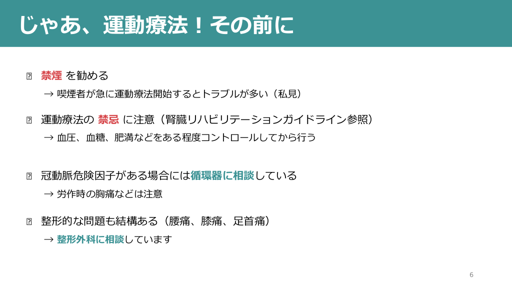 #6. じゃあ、運動療法!その前に 🞐 禁煙 を勧める → 喫煙者が急に運動療法開始するとトラブルが多い(私見) 🞐 運動療法の 禁忌 に注意(腎臓リハビリテーションガイドライン参照) → 血圧、血糖、肥満などをある程度コントロールしてから行う 🞐 冠動脈危険因子がある場合には循環器に相談している → 労作時の胸痛などは注意 🞐 整形的な問題も結構ある(腰痛、膝痛、足首痛) → 整形外科に相談しています 6