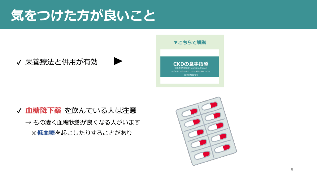#8. 気をつけた方が良いこと ▼こちらで解説 ✔ 栄養療法と併用が有効 ✔ 血糖降下薬 を飲んでいる人は注意 → もの凄く血糖状態が良くなる人がいます ※低血糖を起こしたりすることがあり 8