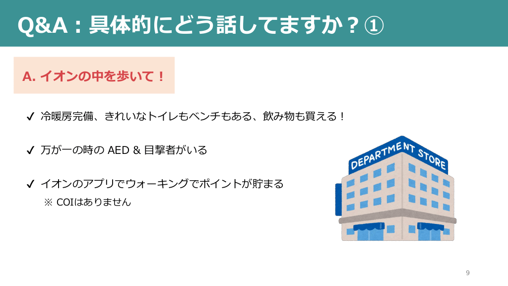 #9. Q&A:具体的にどう話してますか?① A. イオンの中を歩いて! ✔ 冷暖房完備、きれいなトイレもベンチもある、飲み物も買える! ✔ 万が一の時の AED & 目撃者がいる ✔ イオンのアプリでウォーキングでポイントが貯まる ※ COIはありません 9