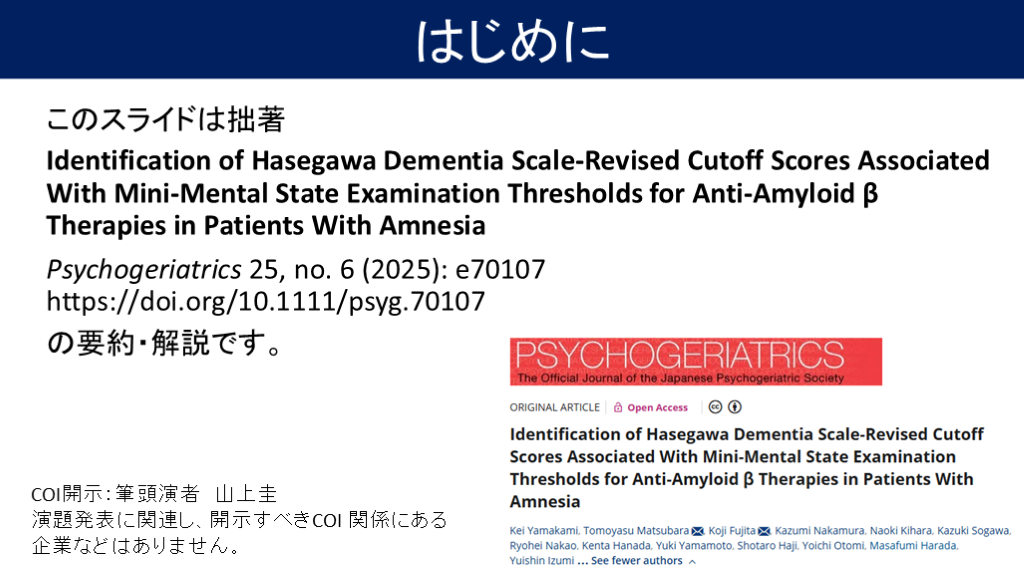 K. Yamakami, T. Matsubara, K. Fujita, et al., “ Identification of Hasegawa Dementia Scale-Revised Cutoff Scores Associated With Mini-Mental State Examination Thresholds for Anti-Amyloid β Therapies in Patients With Amnesia,” Psychogeriatrics 25, no. 6 (2025): e70107 https://doi.org/10.1111/psyg.70107