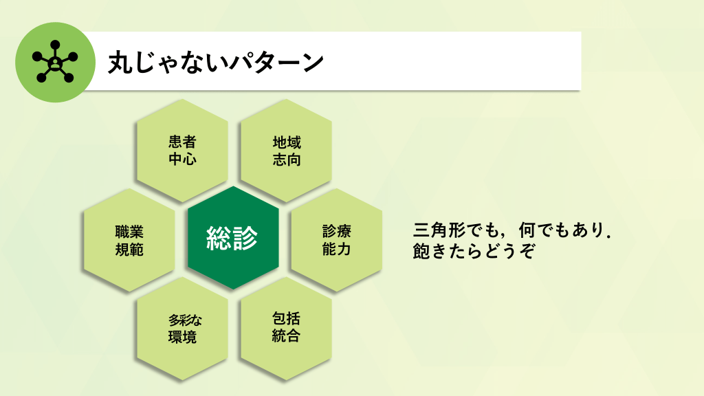 #10. 丸じゃないパターン 患者 中心 職業 規範 地域 志向 診療 能力 総診 多彩な 環境 包括 統合 三角形でも,何でもあり. 飽きたらどうぞ