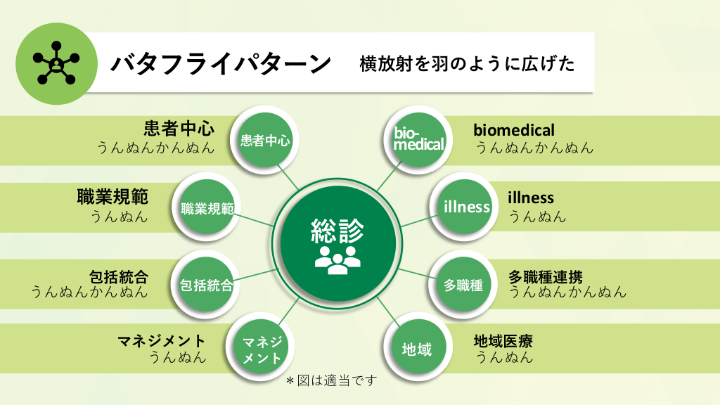 #11. バタフライパターン 患者中心 うんぬんかんぬん 職業規範 うんぬん 包括統合 うんぬんかんぬん 横放射を羽のように広げた biomedical 患者中心 biomedical うんぬんかんぬん illness 職業規範 総診 包括統合 マネジメント うんぬん 多職種 マネジ メント 地域 *図は適当です illness うんぬん 多職種連携 うんぬんかんぬん 地域医療 うんぬん