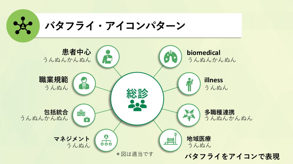 #12. バタフライ・アイコンパターン 患者中心 うんぬんかんぬん biomedical 患者中心 medical うんぬんかんぬん 職業規範 illness うんぬん 総診 包括統合 うんぬんかんぬん 包括統合 マネジメント うんぬん 多職種 マネジ メント 地域 *図は適当です illness うんぬん 多職種連携 うんぬんかんぬん 地域医療 うんぬん バタフライをアイコンで表現