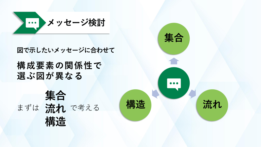#2. メッセージ検討 集合 図で示したいメッセージに合わせて 構成要素の関係性で 選ぶ図が異なる まずは 集合 流れ 構造 で考える 構造 流れ