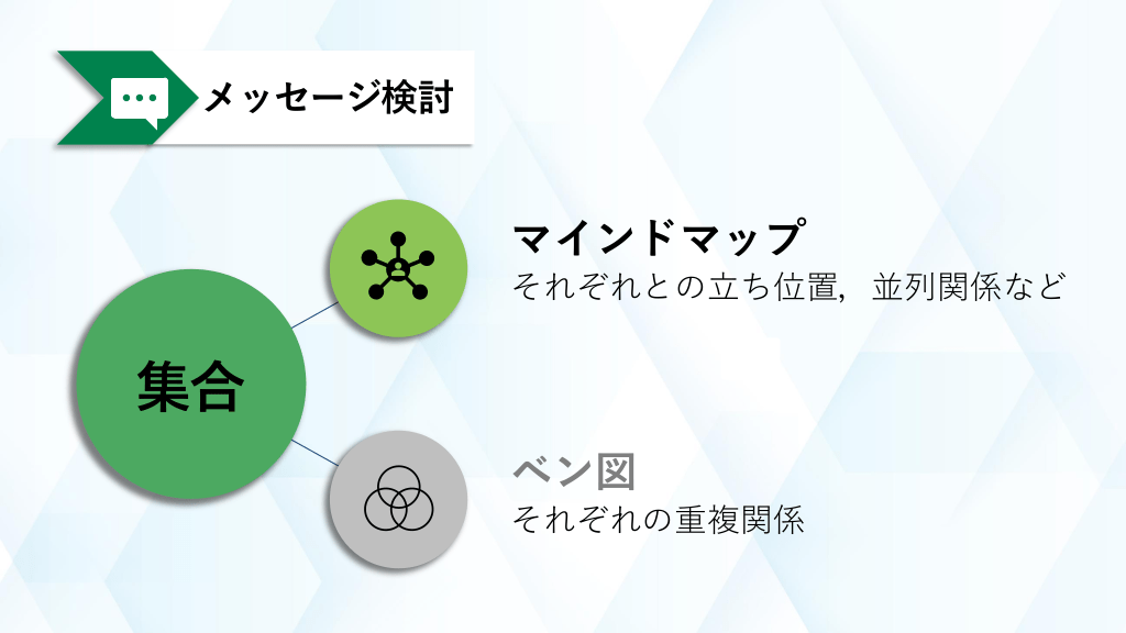#3. メッセージ検討 マインドマップ それぞれとの立ち位置,並列関係など 集合 ベン図 それぞれの重複関係