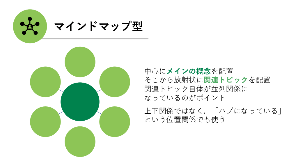 #4. マインドマップ型 中心にメインの概念を配置 そこから放射状に関連トピックを配置 関連トピック自体が並列関係に なっているのがポイント 上下関係ではなく,「ハブになっている」 という位置関係でも使う
