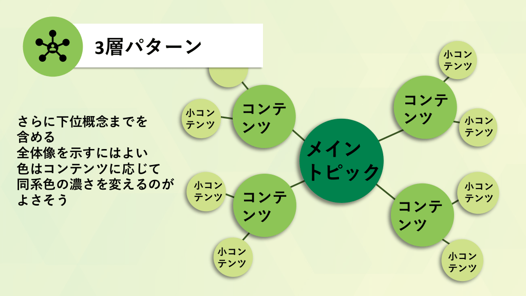 #6. 3層パターン さらに下位概念までを 含める 全体像を示すにはよい 色はコンテンツに応じて 同系色の濃さを変えるのが よさそう 小コン テンツ コンテ ンツ コンテ ンツ 小コン テンツ 小コン テンツ メイン トピック コンテ ンツ 小コン テンツ コンテ ンツ 小コン テンツ 小コン テンツ 小コン テンツ