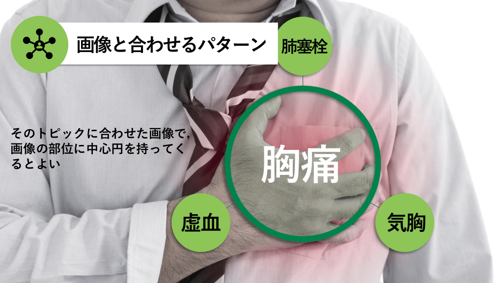 #7. 画像と合わせるパターン 肺塞栓 そのトピックに合わせた画像で, 画像の部位に中心円を持ってく るとよい 虚血 胸痛 気胸