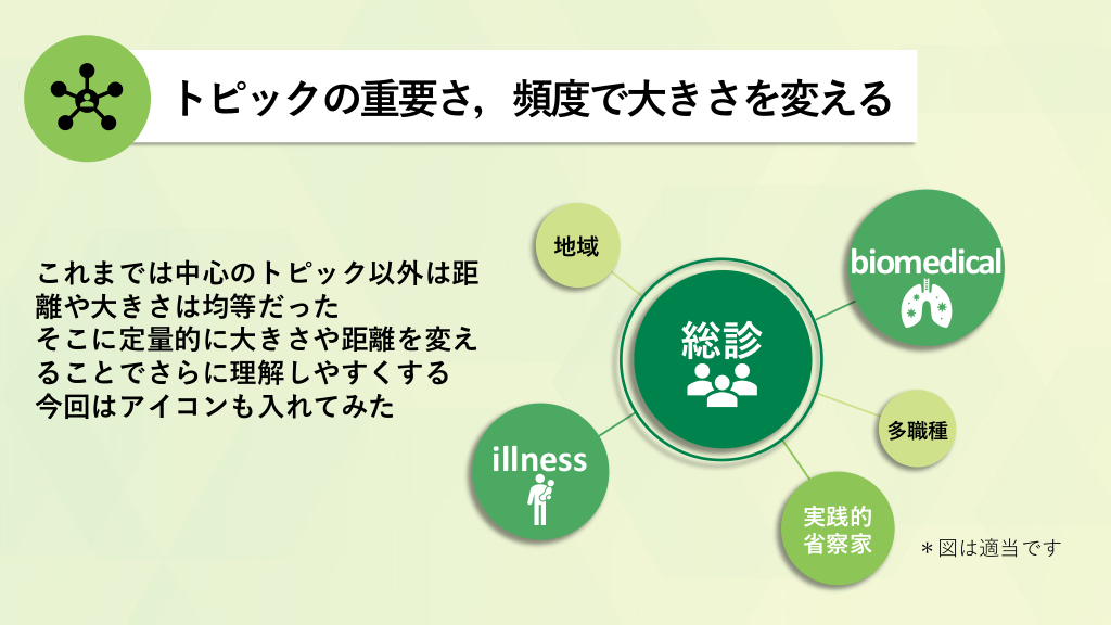 #8. トピックの重要さ,頻度で大きさを変える 地域 これまでは中心のトピック以外は距 離や大きさは均等だった そこに定量的に大きさや距離を変え ることでさらに理解しやすくする 今回はアイコンも入れてみた biomedical 総診 多職種 illness 実践的 省察家 *図は適当です