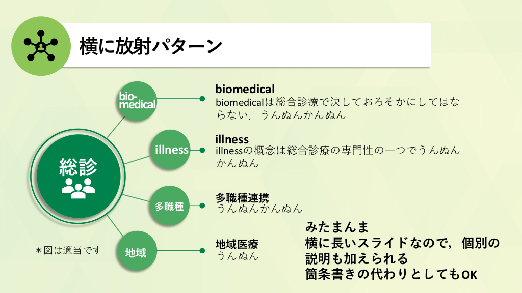 #9. 横に放射パターン biomedical illness 総診 多職種 *図は適当です 地域 biomedical biomedicalは総合診療で決しておろそかにしてはな らない.うんぬんかんぬん illness illnessの概念は総合診療の専門性の一つでうんぬん かんぬん 多職種連携 うんぬんかんぬん 地域医療 うんぬん みたまんま 横に長いスライドなので,個別の 説明も加えられる 箇条書きの代わりとしてもOK